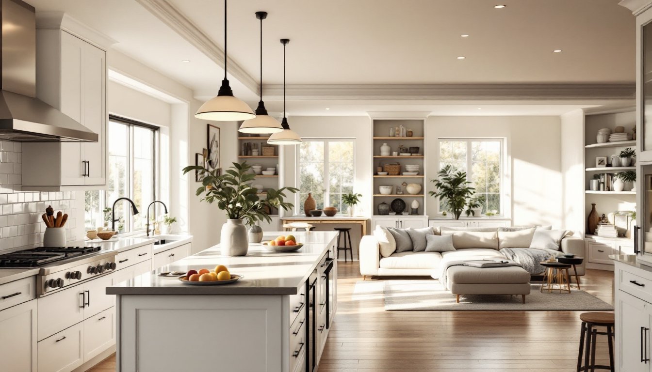 Lighting needs layers in open concepts. Task lighting (under-cabinet strips, pendant lights over islands) handles cooking. Ambient lighting (recessed or track fixtures) sets overall mood. Accent lighting (a statement chandelier or wall sconces) adds character. Dimmer switches let you adjust zones independently, bright for cooking, soft for evening entertaining.